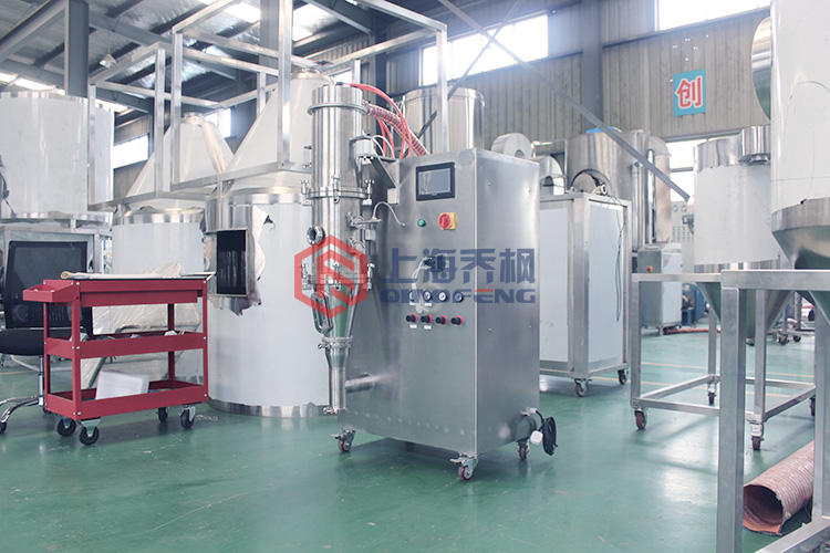 空氣經(jīng)加熱、凈化后,由引風(fēng)機(jī)從下部引入,經(jīng)漏斗的孔板篩板。在工作室內(nèi),通過攪拌和負(fù)壓形成流化。在快速蒸發(fā)后,水被廢氣帶走,材料很快干燥。